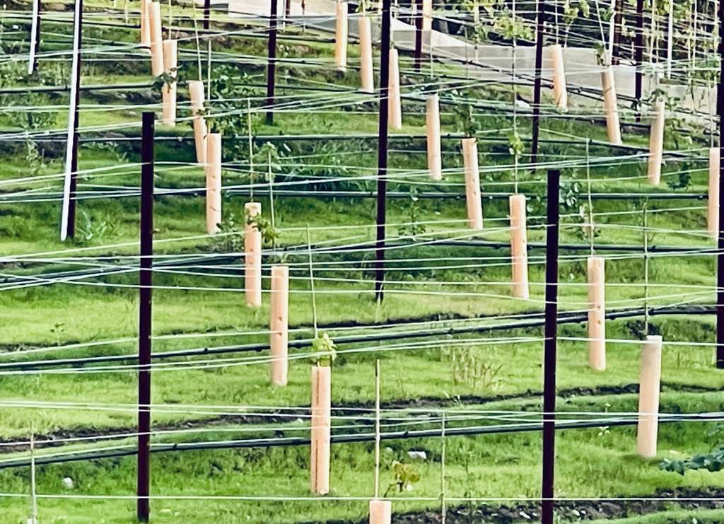 附近鄰居最近把一片山坡地開墾成葡萄園,看到一排排整齊的葡萄幼株直立,白線拉直,確定行間舆株間距離相同,像一隊童子軍排列,迎著冬陽,井然有序,精神抖擻。