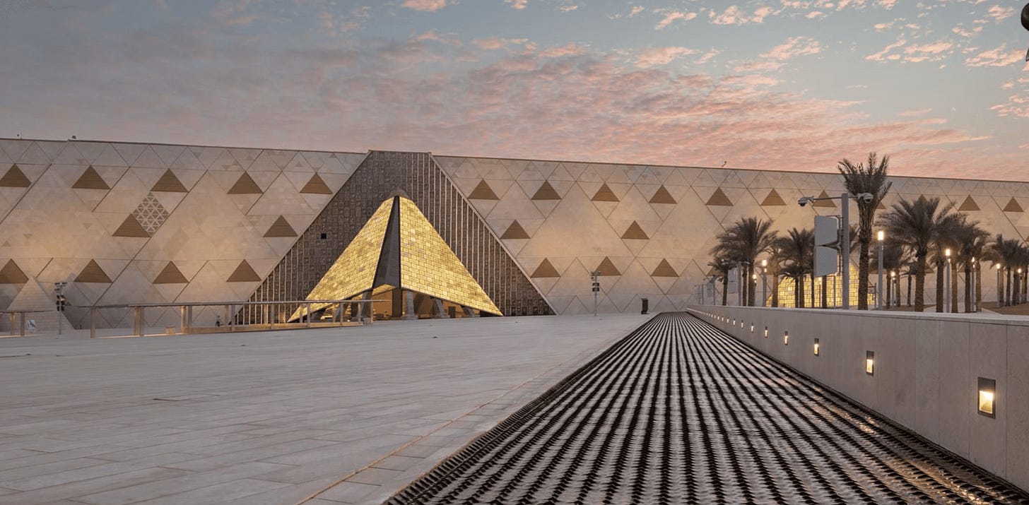 經過20多年漫長歲月的興建,耗資12億美元,位於金字塔旁的大埃及博物馆終於在2025年11月1日揭幕。在人類歷史中,長達3000多年金字塔被視為世界最高建築物,是古埃及人對人類從生到死,再到重生的文明想像,現在大埃及博物館的完成,像是在古埃及文明加上儒家中庸的新注解。