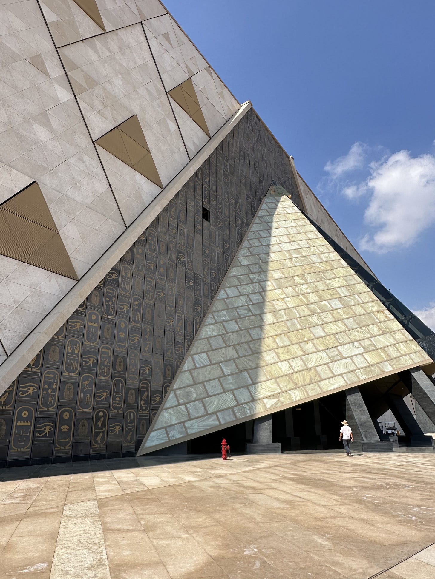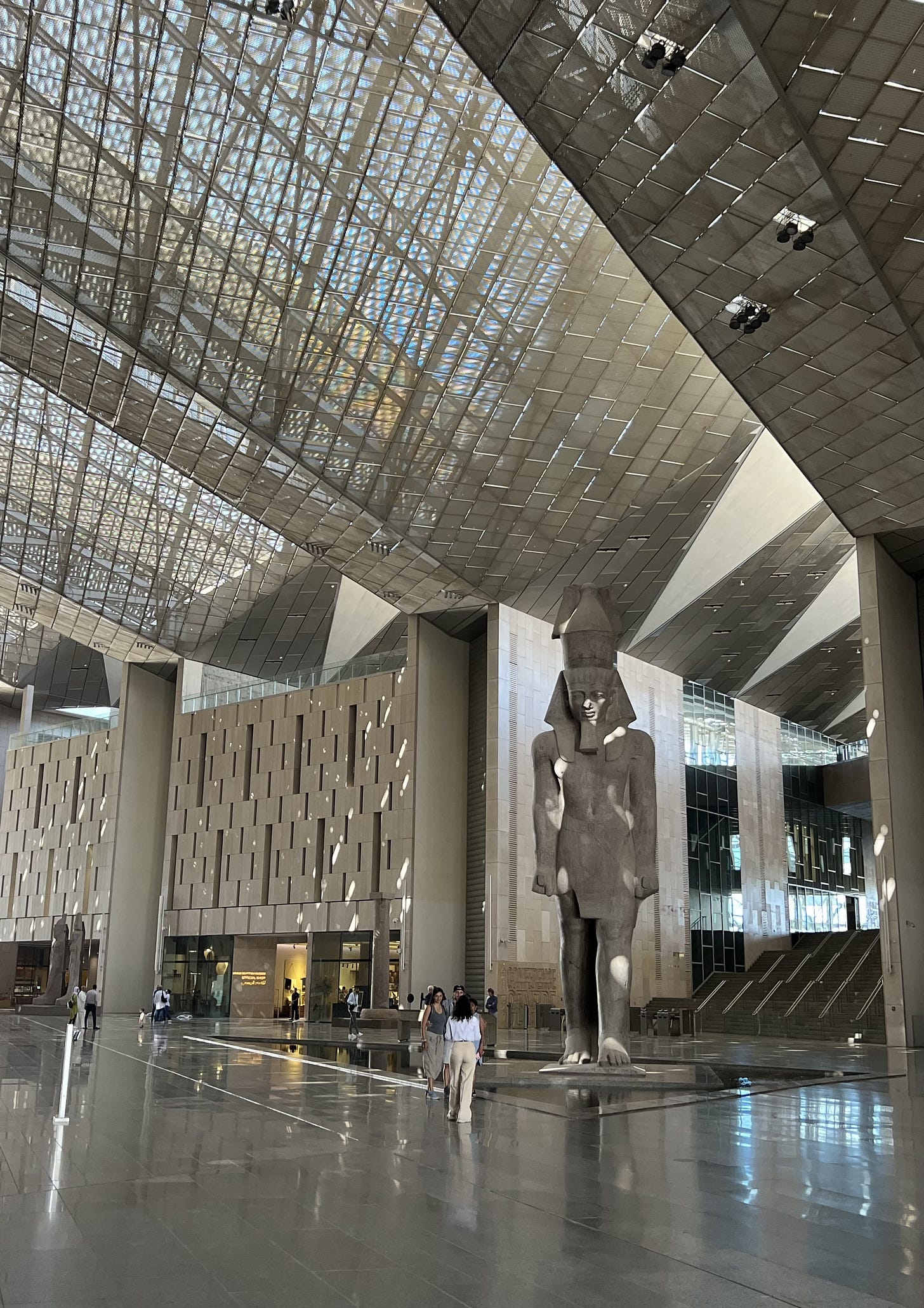 離開金字塔,轉往和金字塔相呼應的大埃及博物館。1902年埃及國家博物館開幕,憑藉豐富的收藏和展出,受到考古學家和埃及學家的讚揚。百年下來,國家博物館擁擠不堪,許多古物封存地下室。二十世紀末,埃及政府構想在金字塔旁興建一全世界最大的考古學博物館,取名大埃及博物館,希望藉此架接古埃及和現代埃及。這是充滿想像力的計劃,就像法老王興建金字塔,充滿雄心壯志。2003年一共有八十三個國家的建築師,提出一千五百五十七份設計方案,包括世界頂級建築師Zaha Hadid 等人,最終,三十多歲哈佛大學畢業的華裔建築師彭士佛(Shih-Fu Peng)和夫人Roisin Heneghan的設計圖,獲得青睞,被選為建築方案。整個建築界為之驚訝,彭士佛自己也不敢相信獲選,連打3次電話去確認。過去二十年,博物館興建歷經財政困窘,政治動盪和疫情蔓延,開幕一延再延,目前在試營運,2024年將登上舞台。