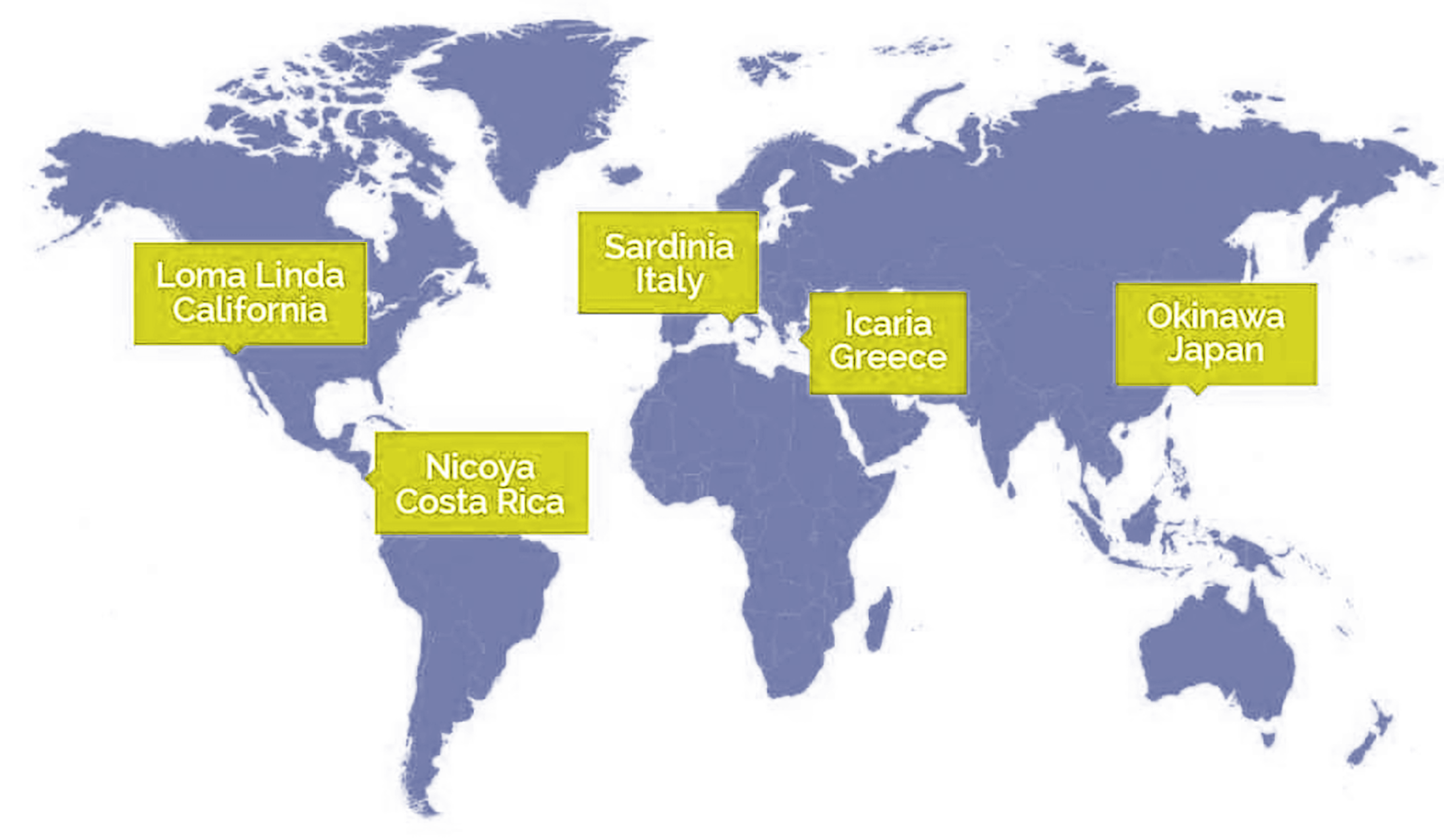 Today, five regions are widely recognized as Blue Zones : Okinawa, Japan; Sardinia, Italy; Ikaria, Greece; the Nicoya Peninsula, Costa Rica; and Loma Linda, California, USA.