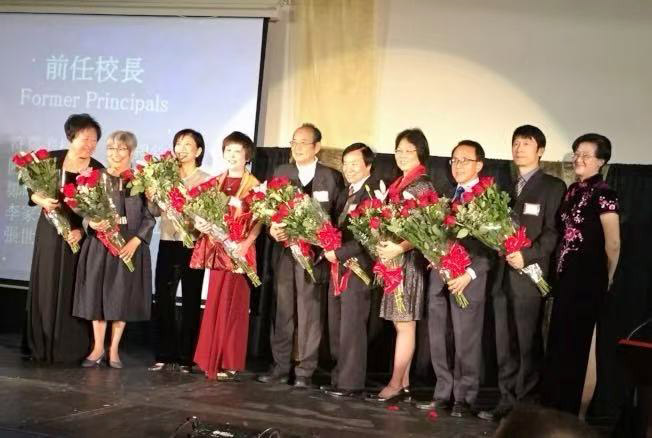 爾灣中文學校前校長鄭峰(左三)與歷屆校長接受表揚。