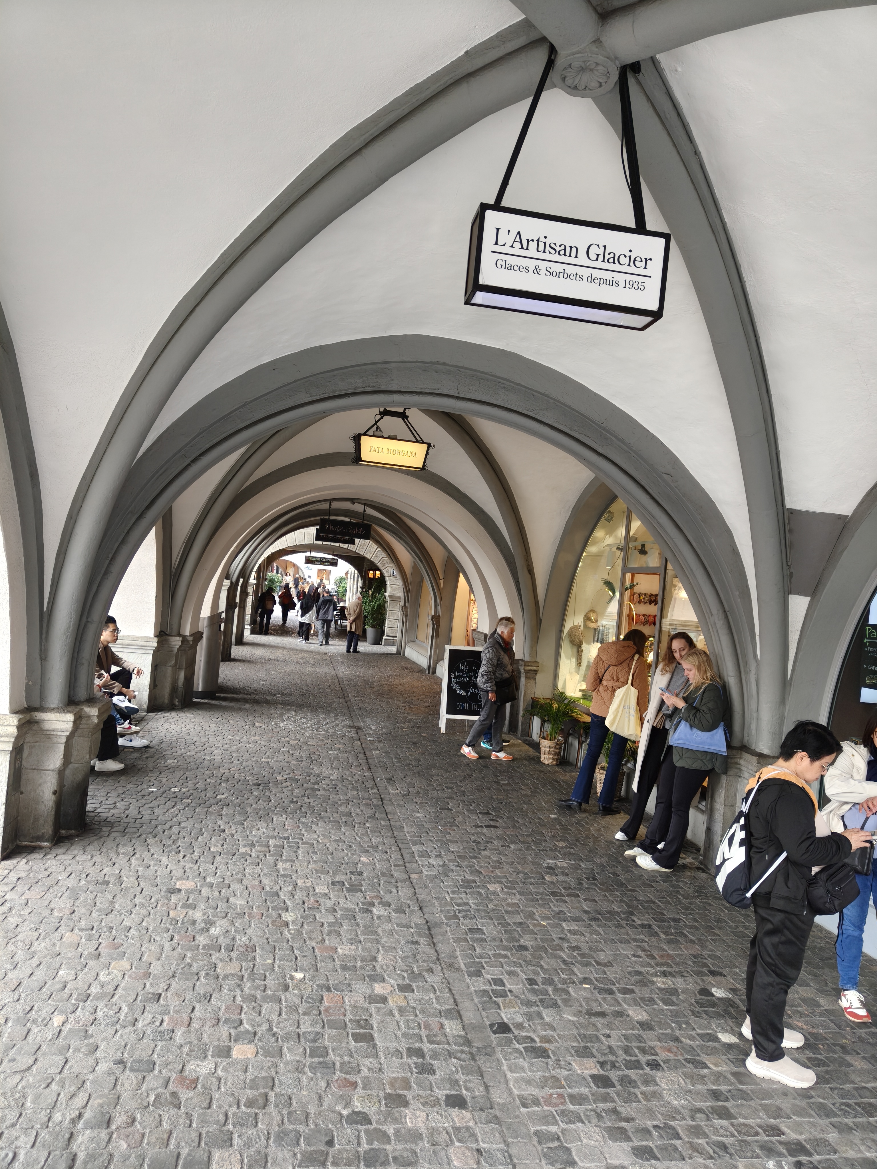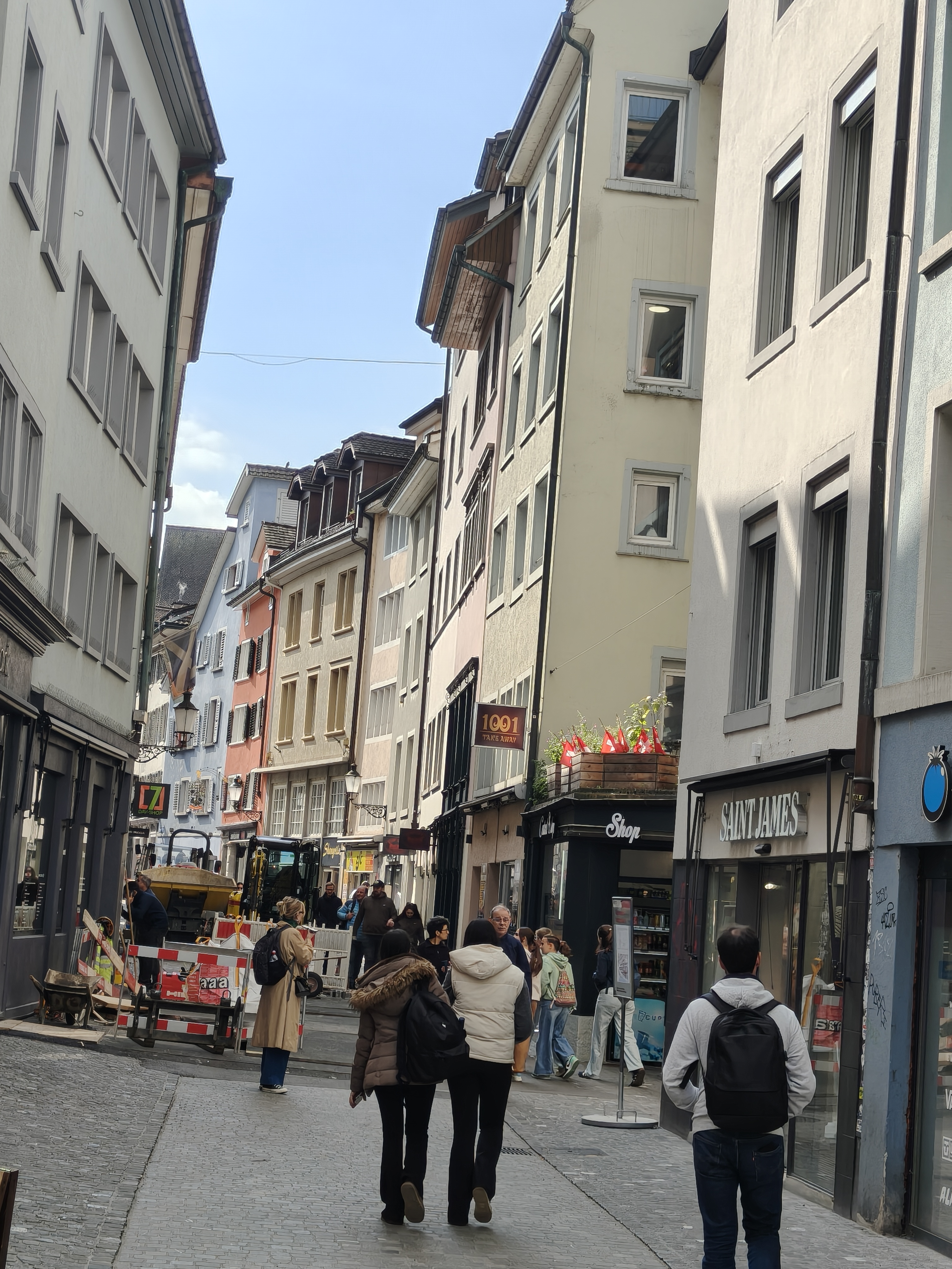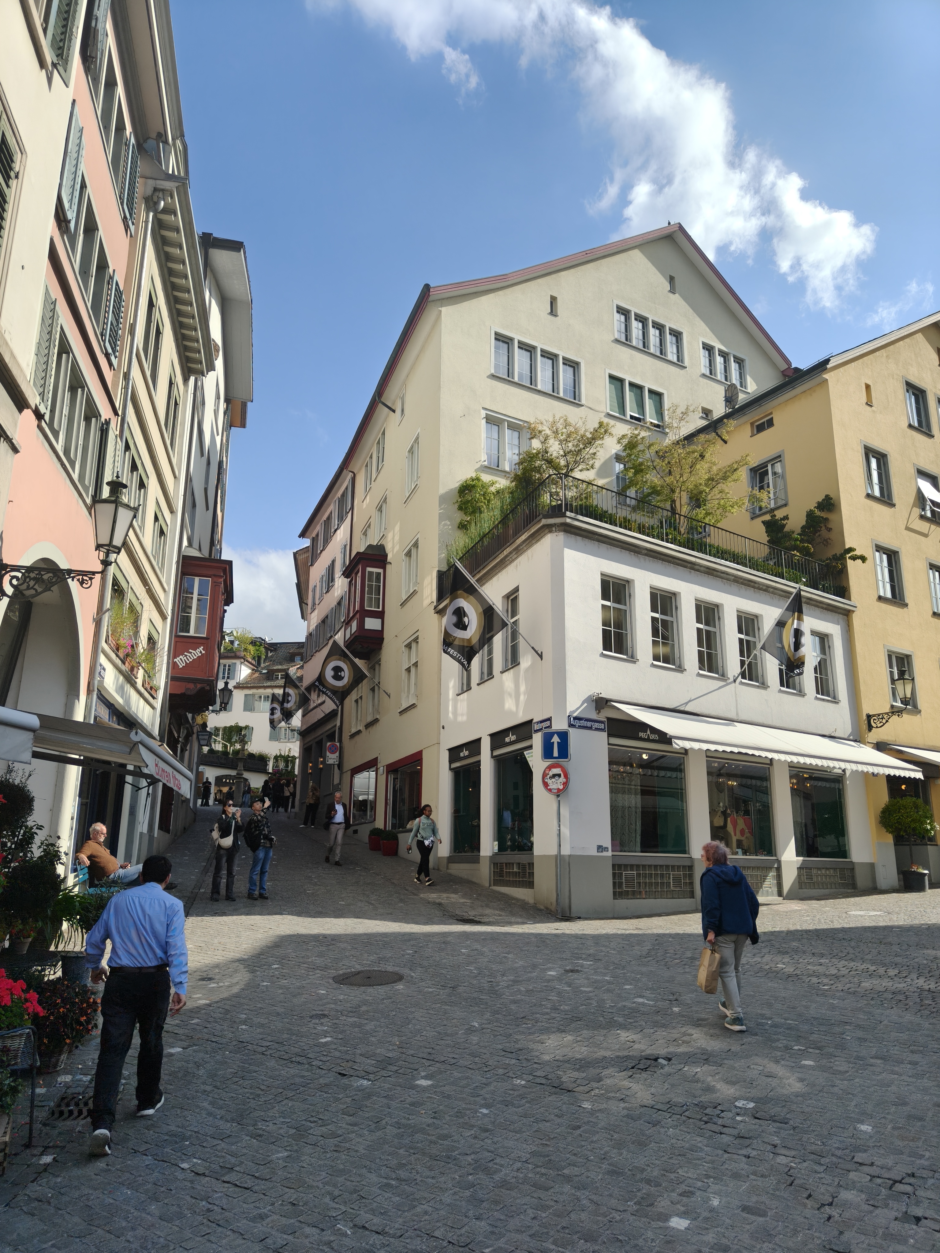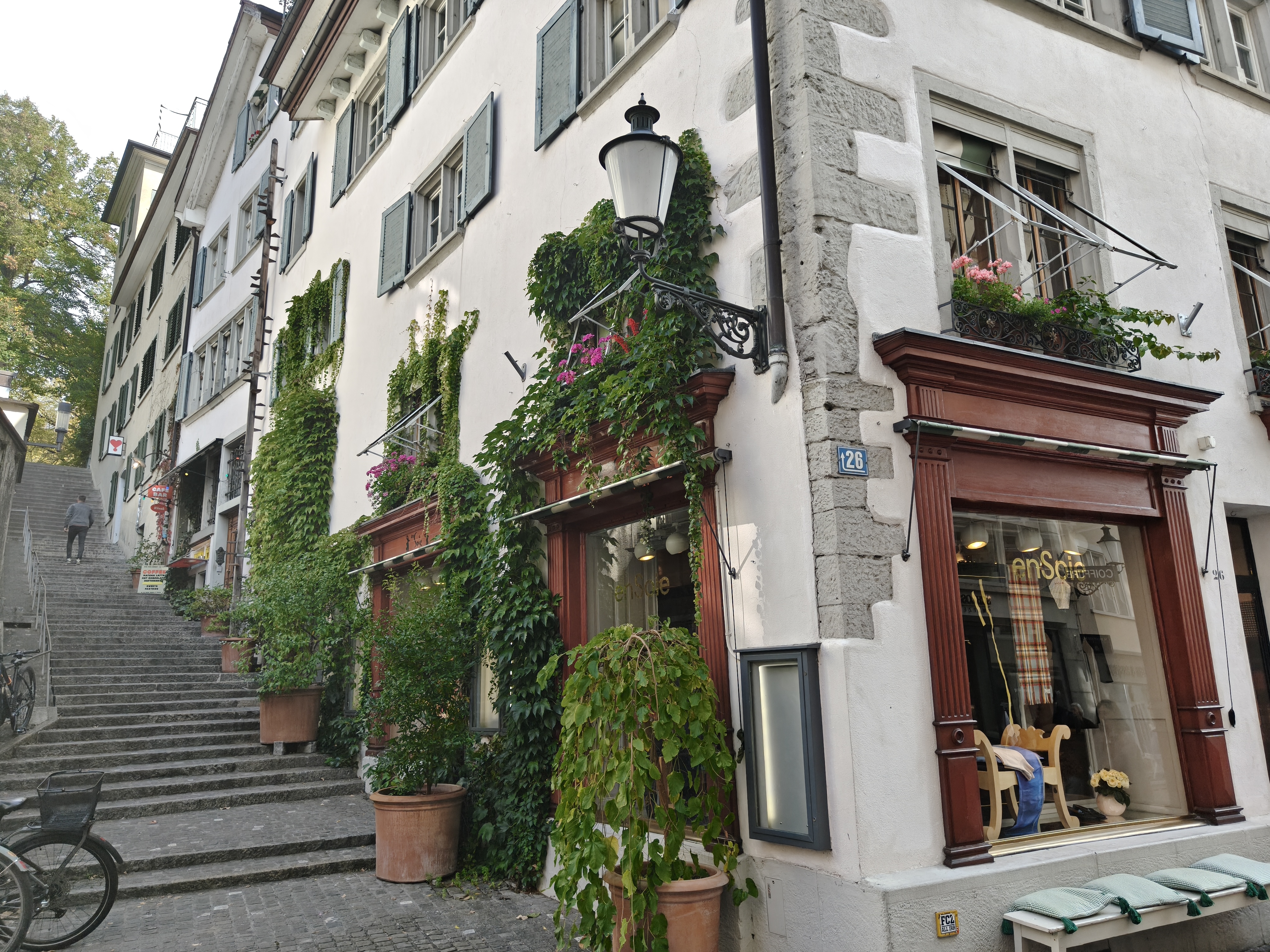 這是一條蘇黎世老城的街巷。白色的老房子沿著石階而建,牆面爬滿綠藤,窗前點綴著花盆。街道不寬,卻層次分明,階梯向上延伸,帶著中世紀城市特有的節奏。老式路燈、木框櫥窗和靜靜開放的小店,讓這裡顯得安靜、溫暖又充滿生活氣息,彷彿時間在此放慢了腳步。