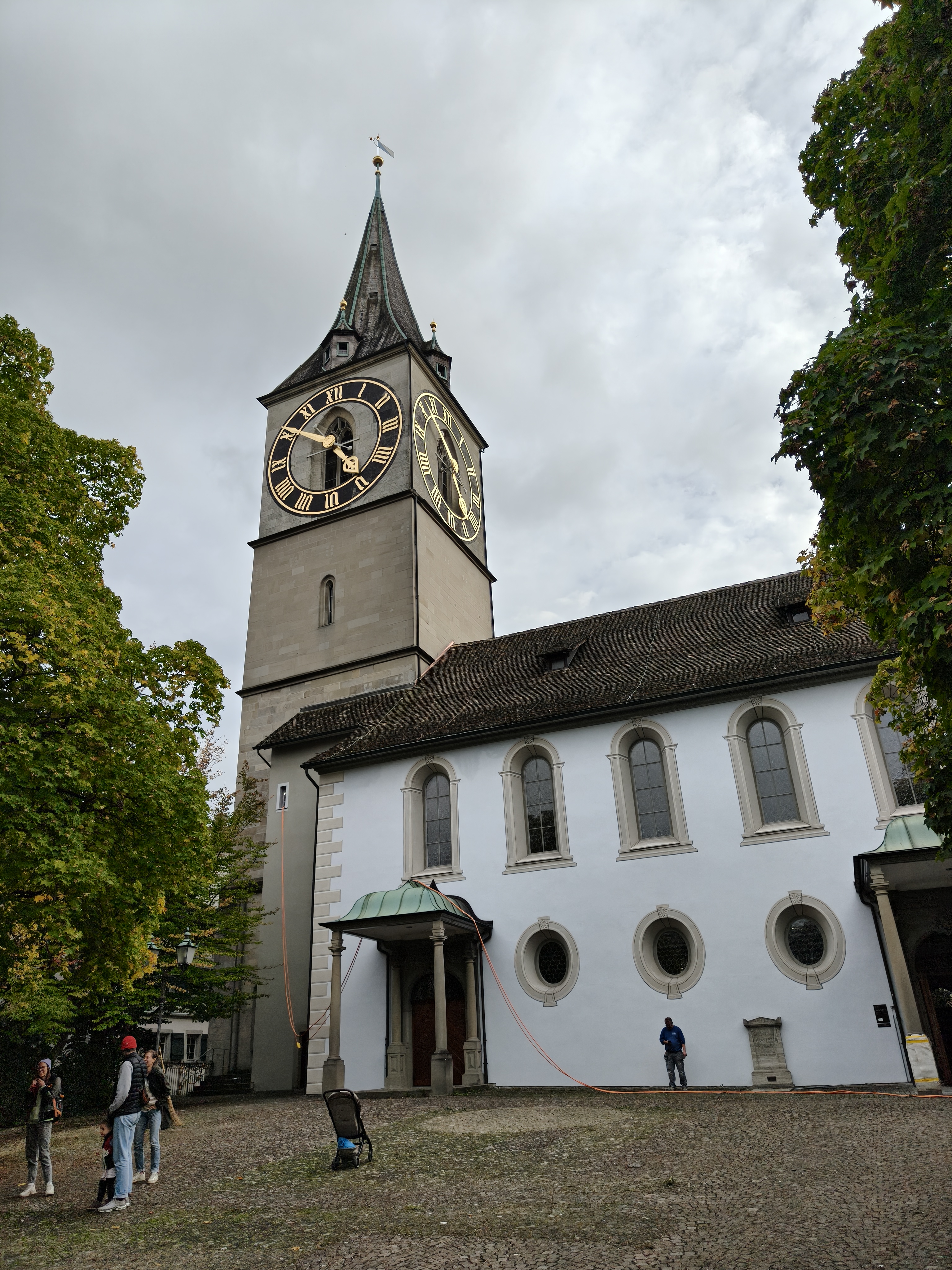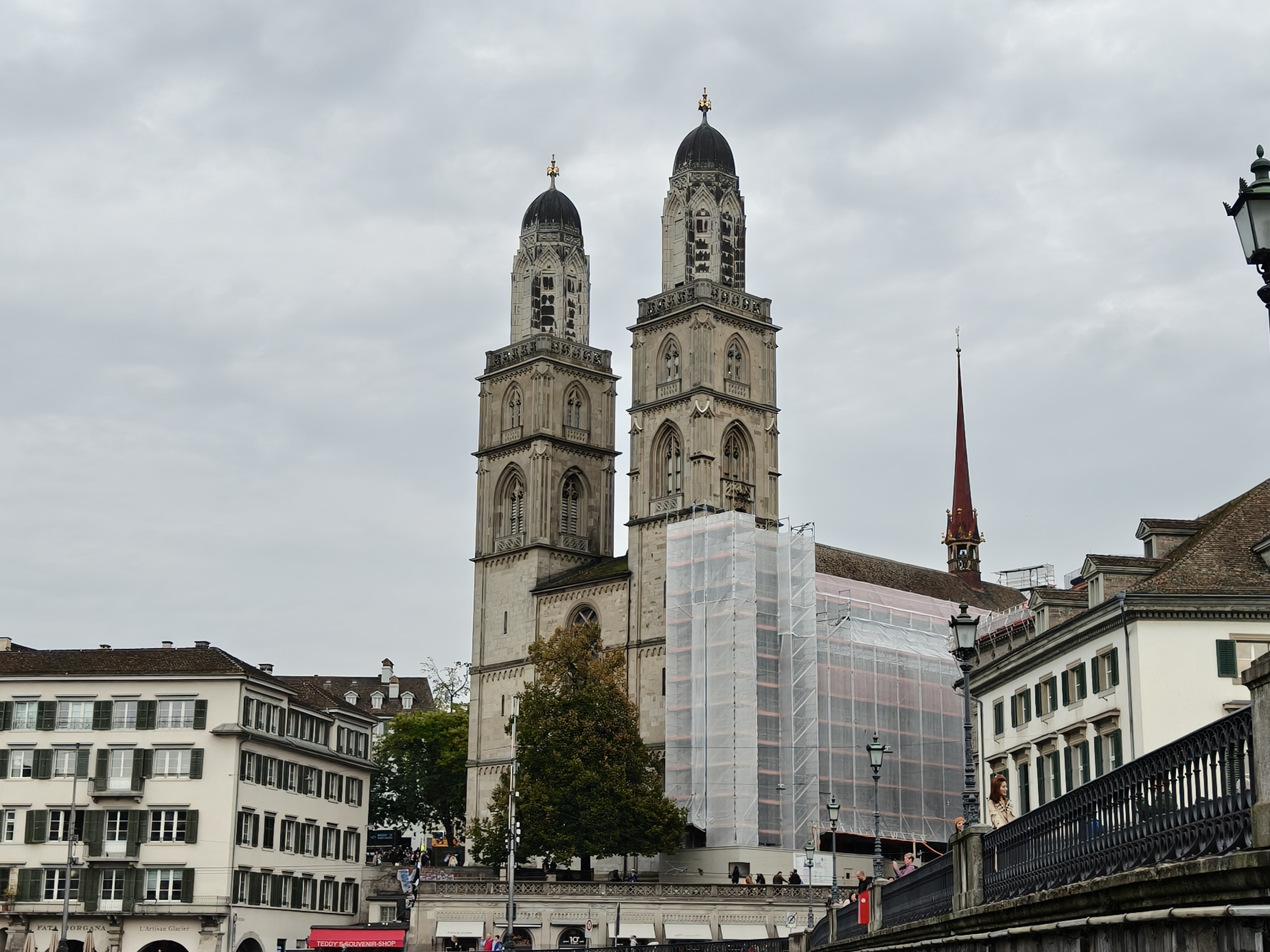 沿著河岸前行,視線很容易被那座雙塔教堂吸引。蘇黎世大教堂矗立在河畔,雙塔高聳而莊嚴,是老城區最醒目的地標之一,在屋頂線條之上標記出城市的輪廓。