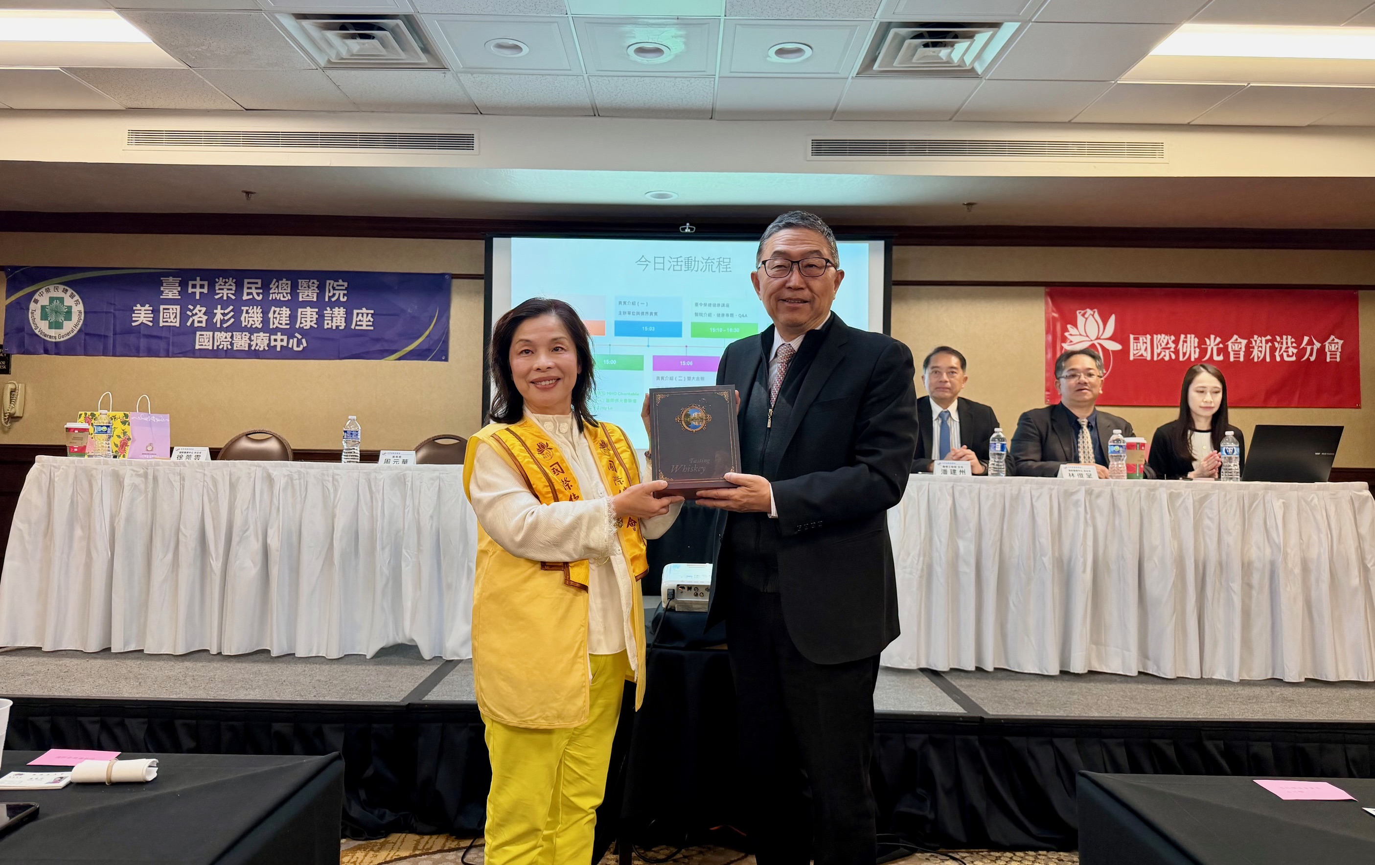 台中榮總副院長周元華在講座後致贈紀念品感謝MHG慈善基金會創辦人羅麗惠的邀請,和民眾分享醫療保健知識與服務資訊。羅麗惠則特別感謝國際佛光會洛杉磯分會長蔡月琴與西來寺滿光法師的支持,鼓勵會眾來聆聽。