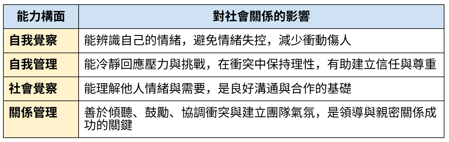 當一個人學會更好地理解情緒、管理反應,並回應他人的感受時,人際 互動的品質也會隨之提升,社交連結不再只是表面的往來,而能逐步發展成穩定而有支持力的關係。