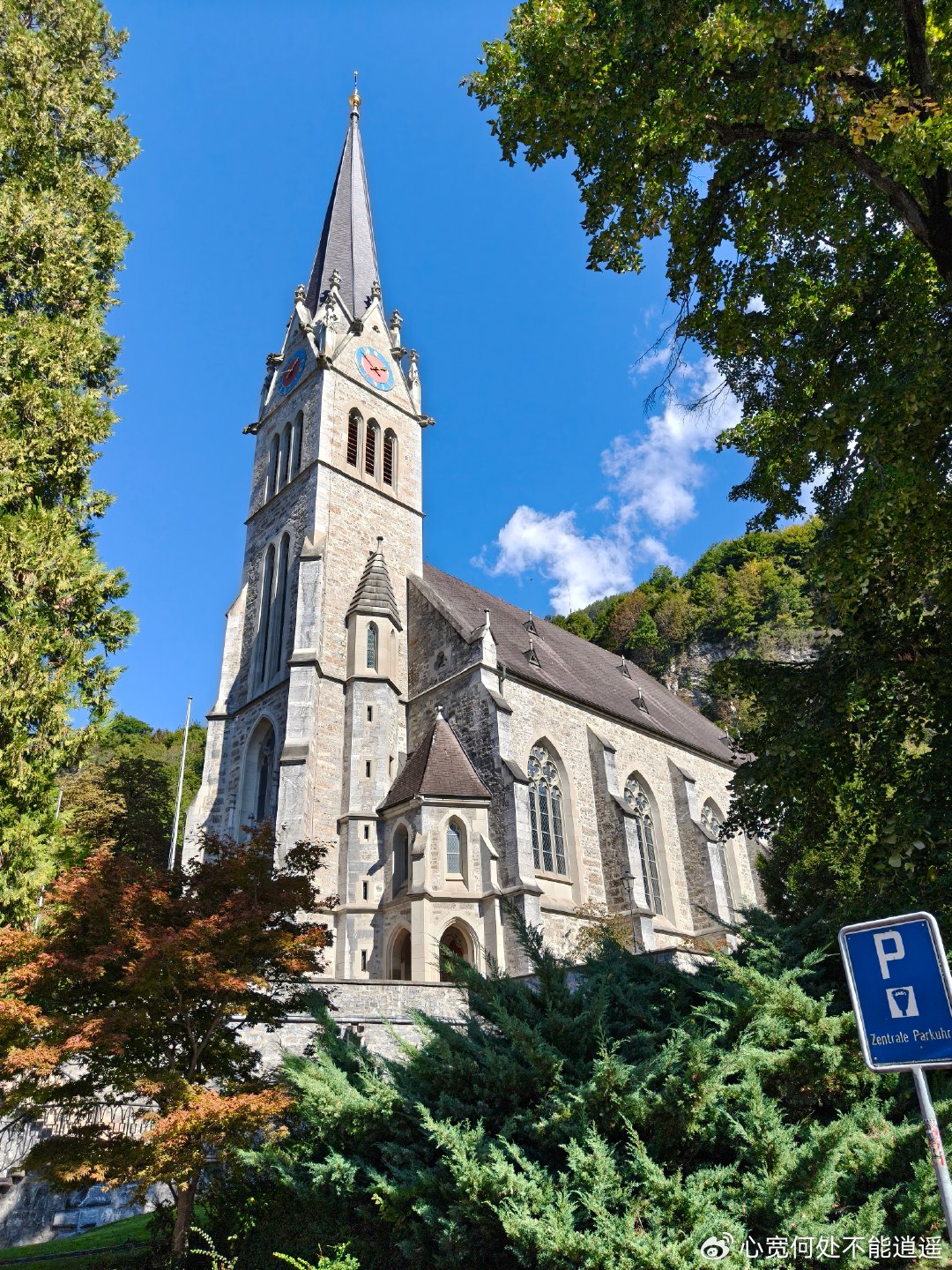 山坡腳下,灰色石砌外牆靜靜矗立。高聳的尖塔直指天空,鐘面色彩醒目,是瓦杜茲最顯眼的地標之一-瓦杜茲教堂。