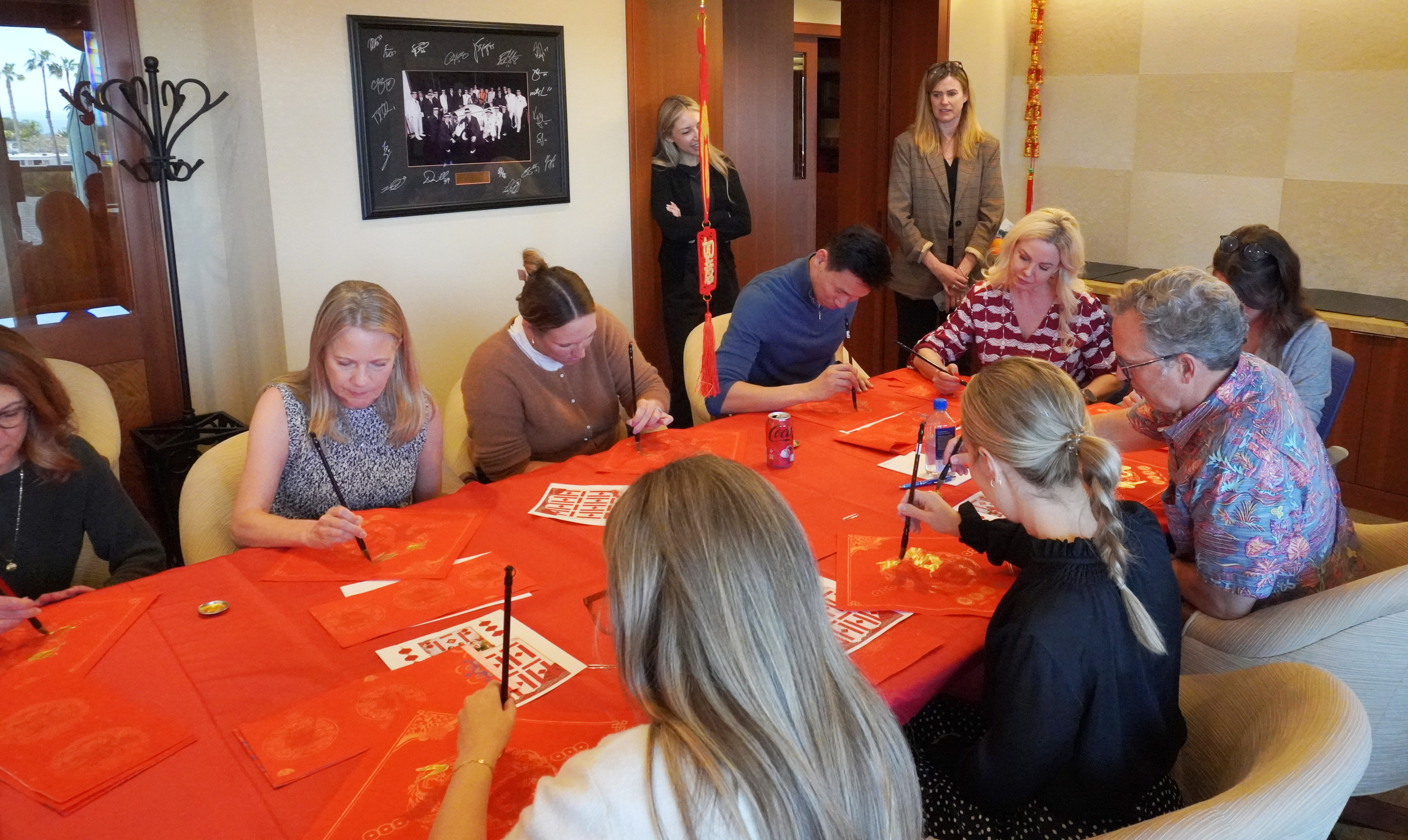Using brushes dipped in gold ink, attendees wrote couplets and the character “Fu” on red paper, while learning the auspicious meaning of red decorations and the legend of the Nian monster.