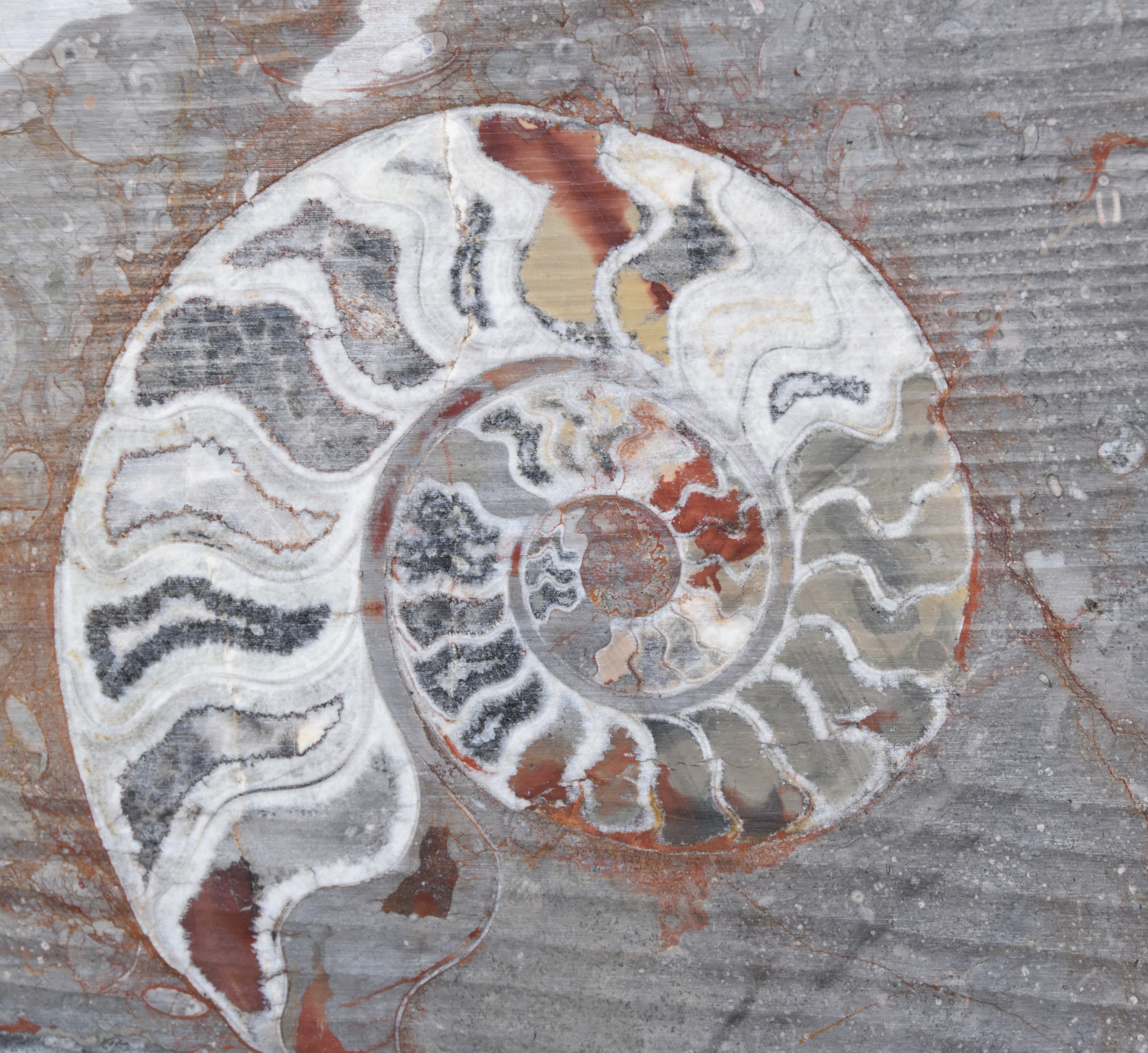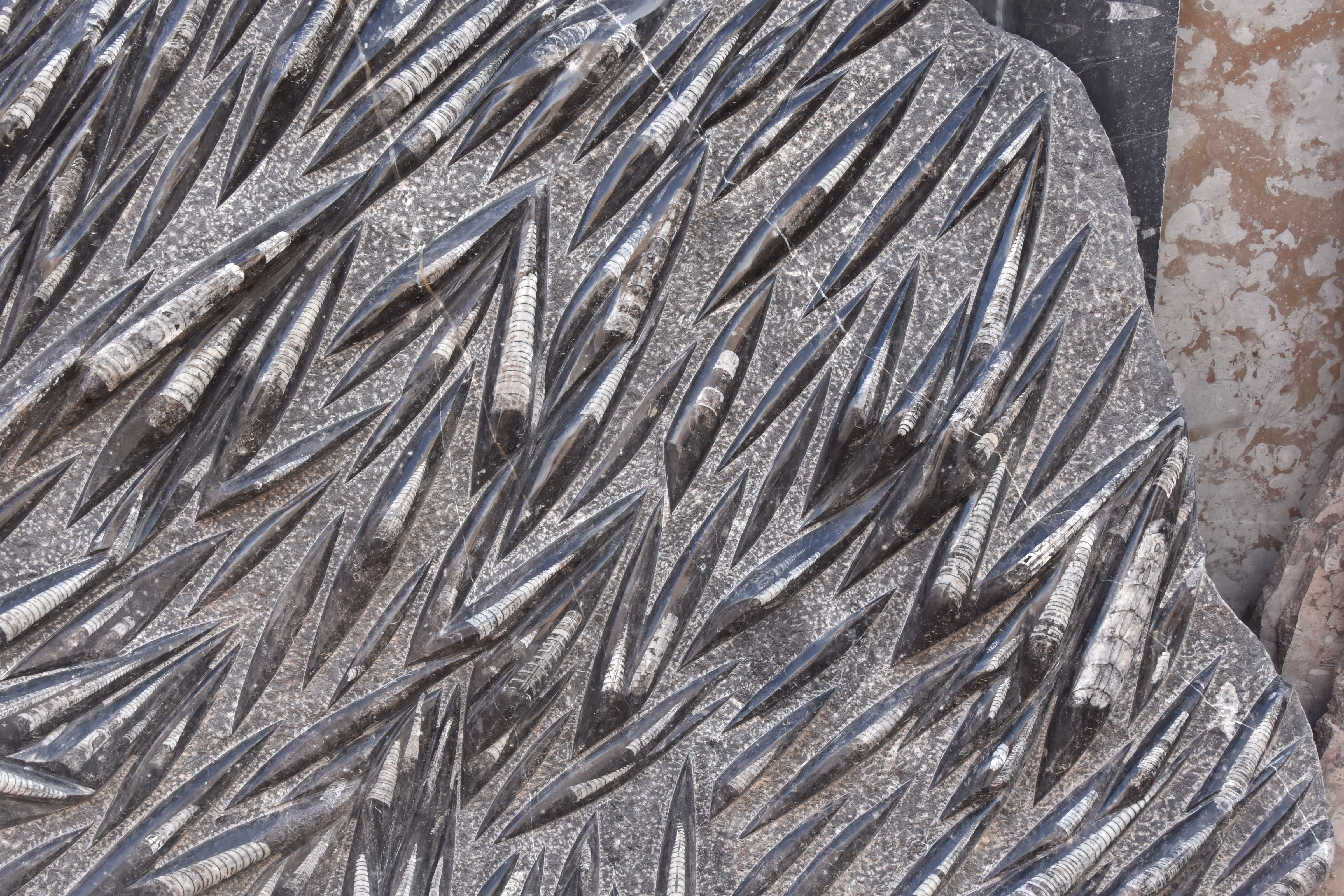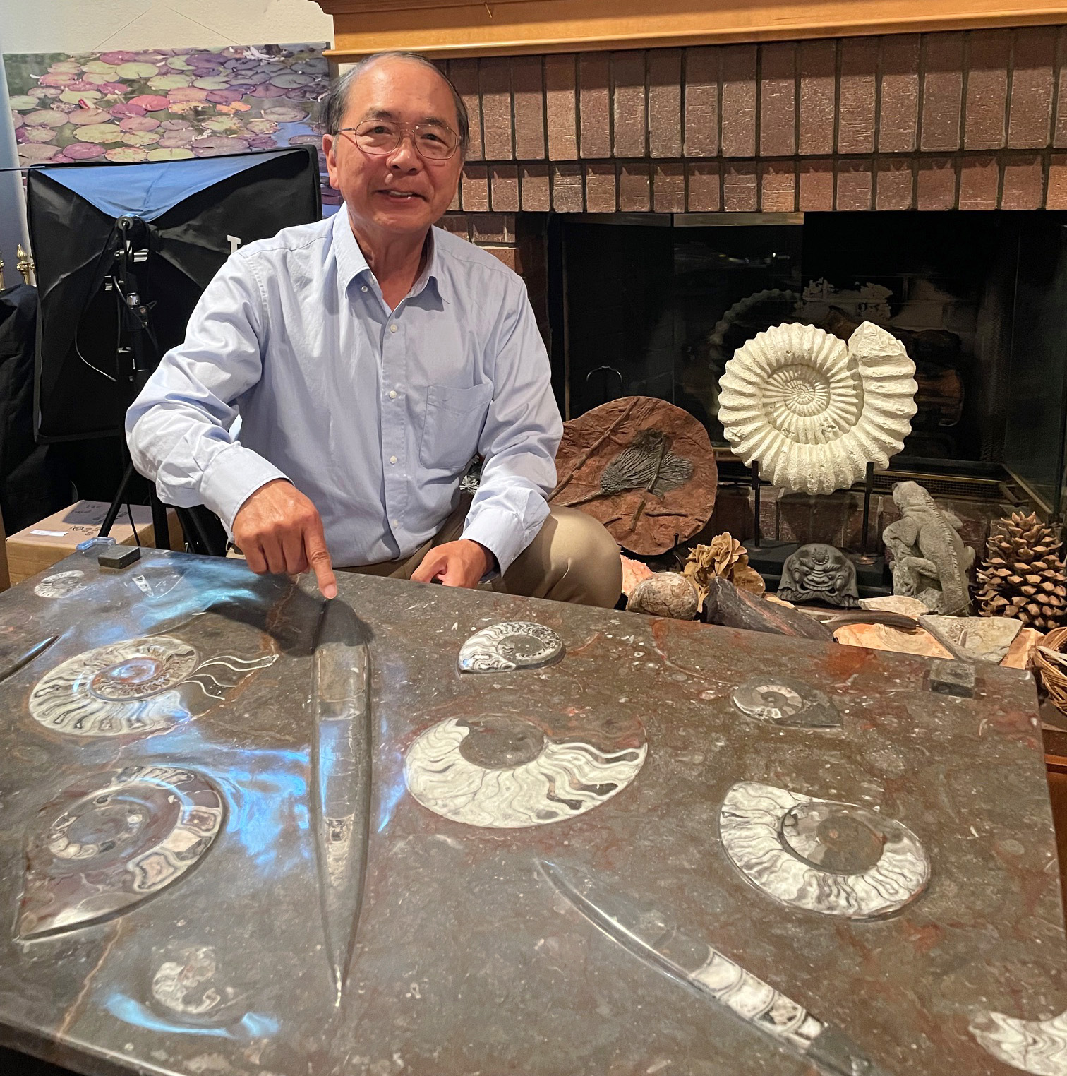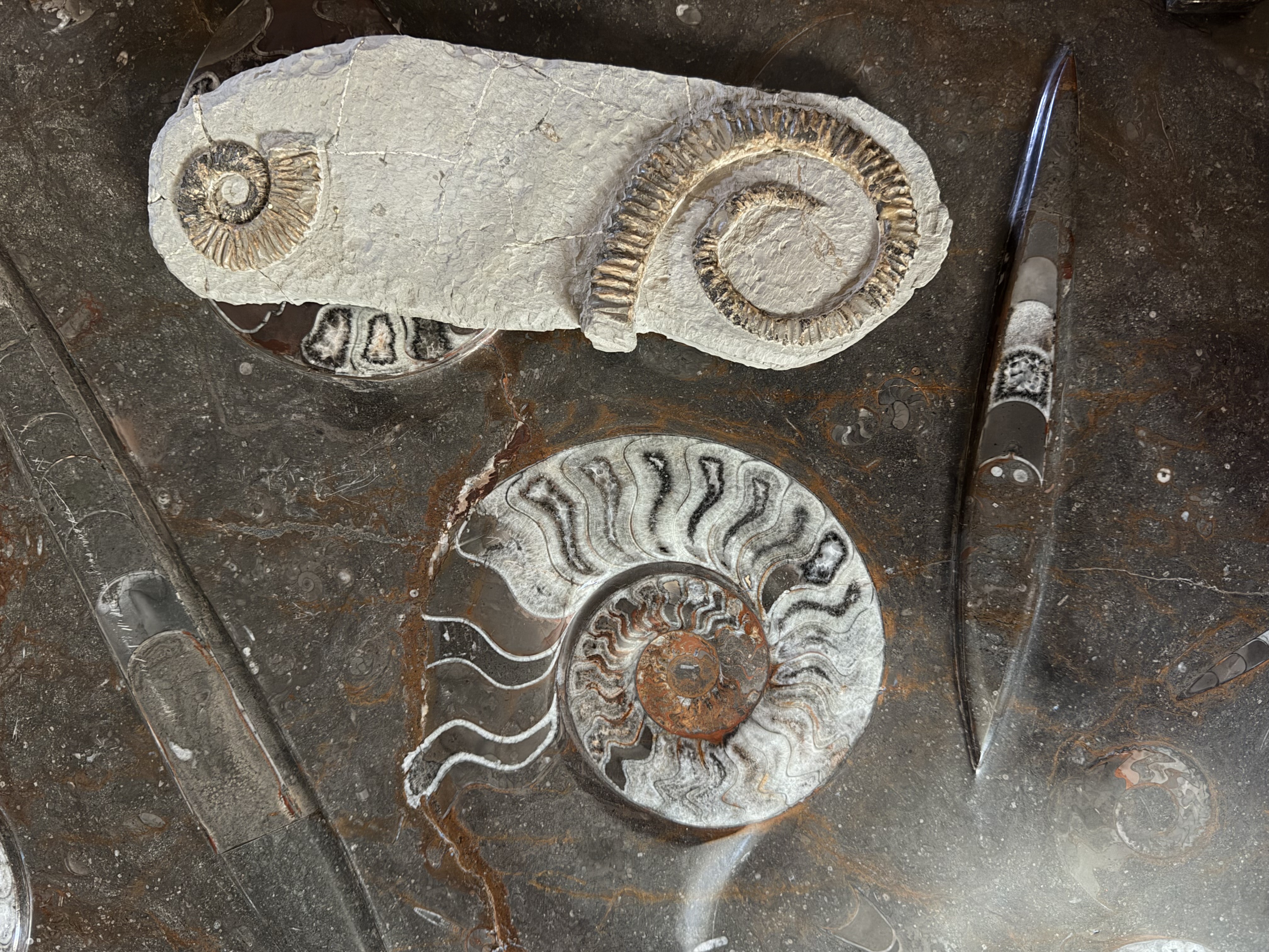 當地岩層富含三葉蟲、腕足類與頭足類化石,如今已成為全球知名的古生物標本產地。就在那裡,我們買下一張桌面上同時鑲嵌著鸚鵡螺與直殼頭足類的化石桌。