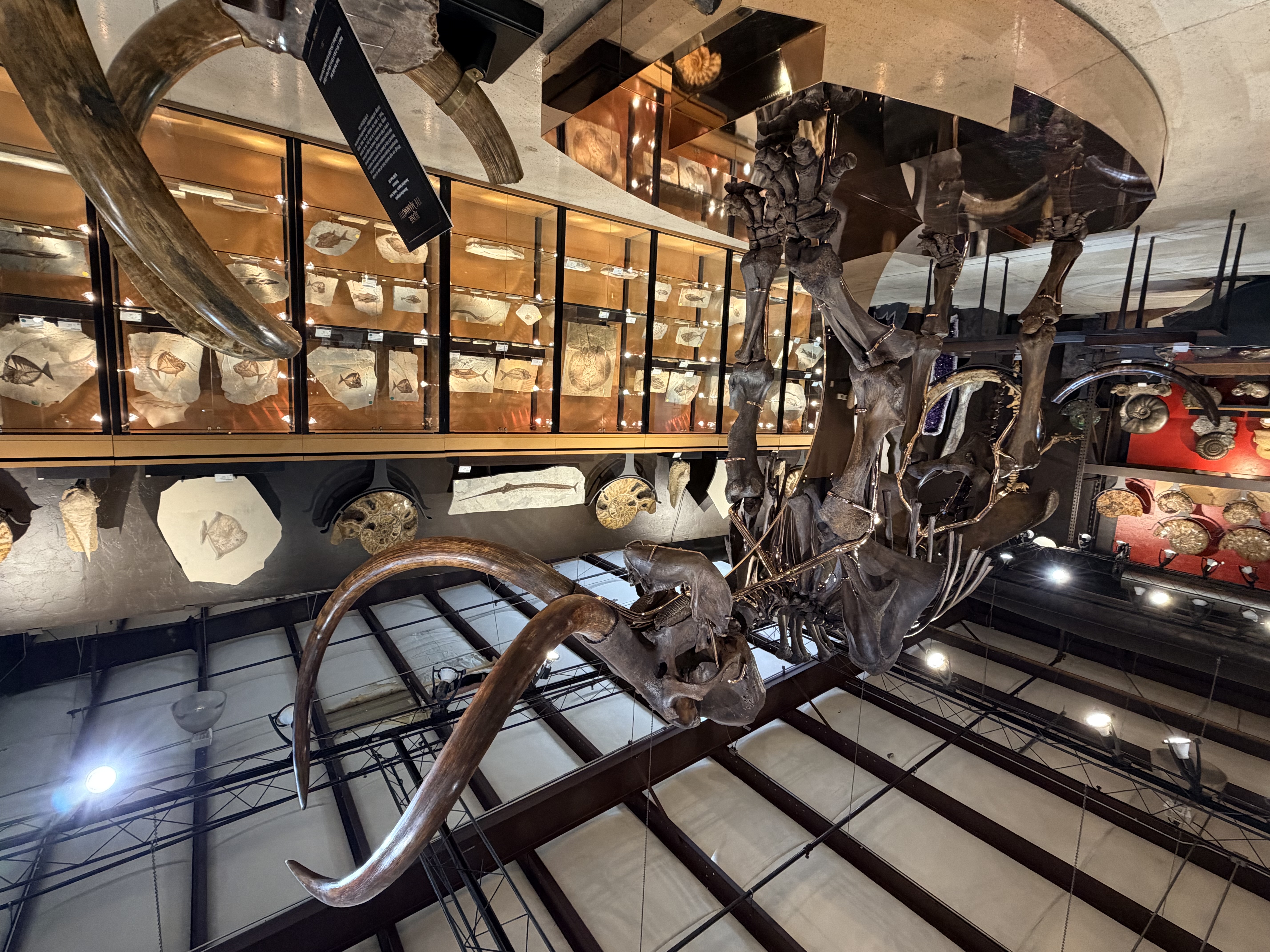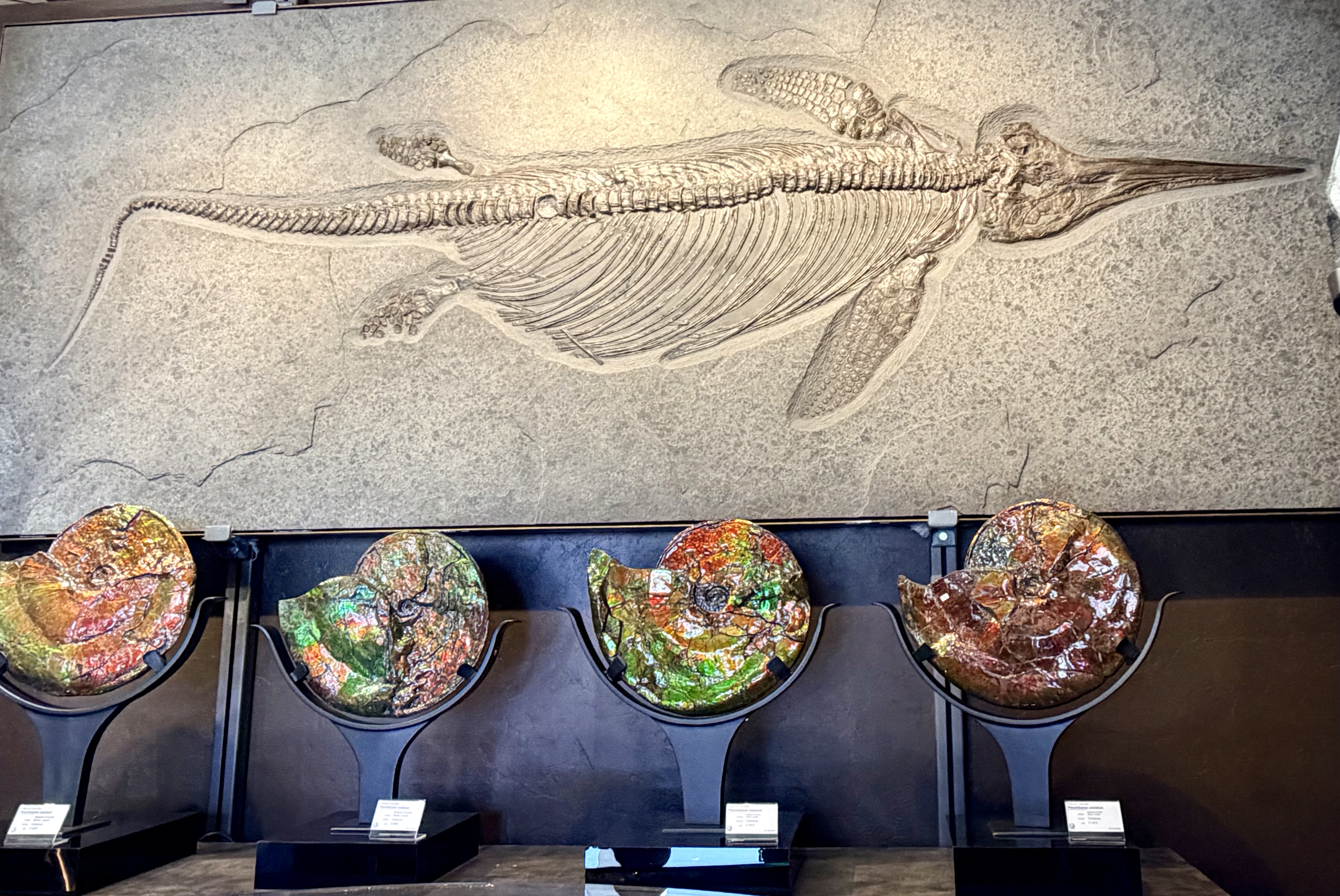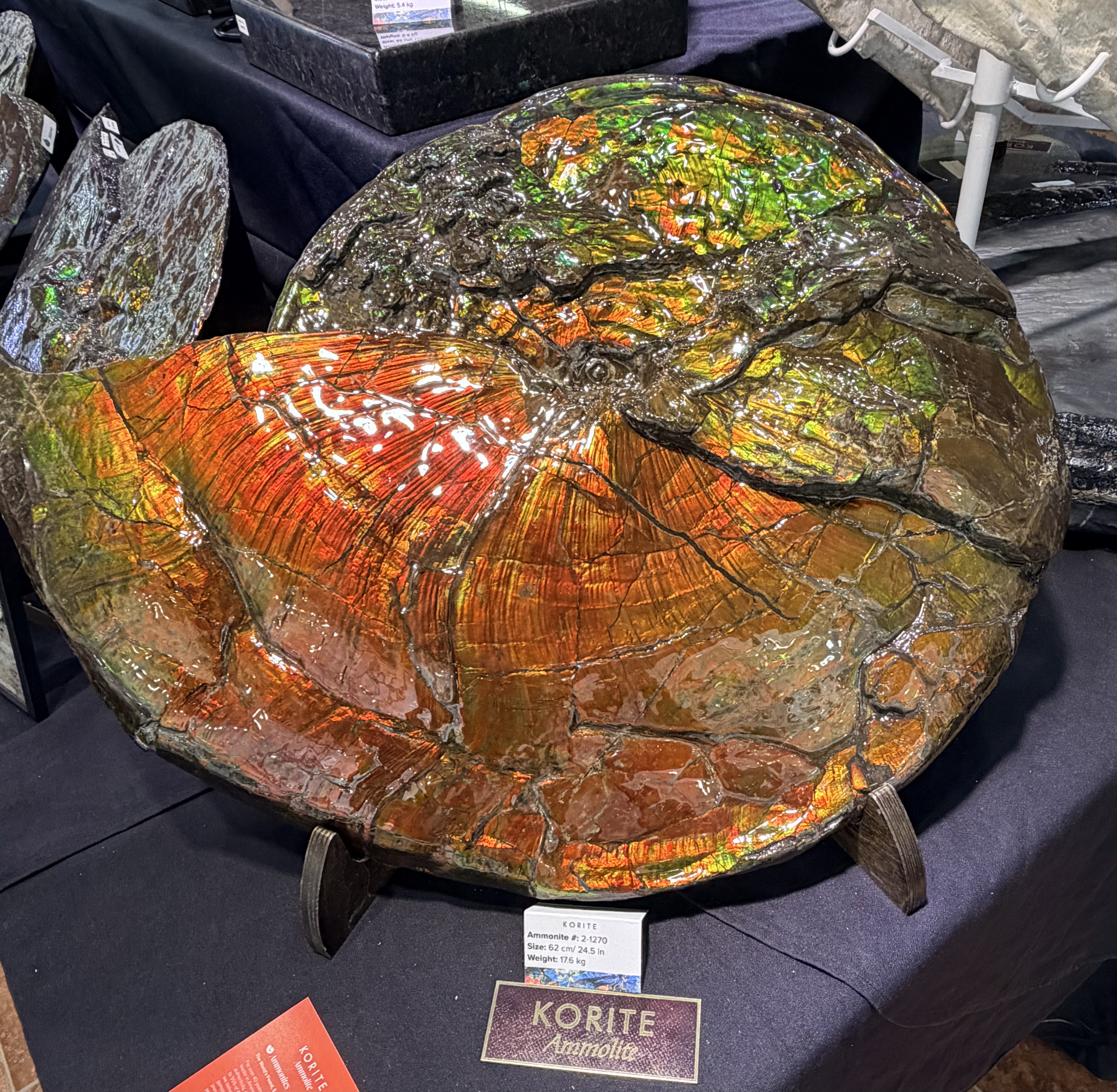 在同一展會中,我們也看到另一種迷人的化石——菊石(Ammonite)。它們的螺旋殼呈現出精緻的幾何節律,有些標本甚至帶著虹彩般的火焰色澤。