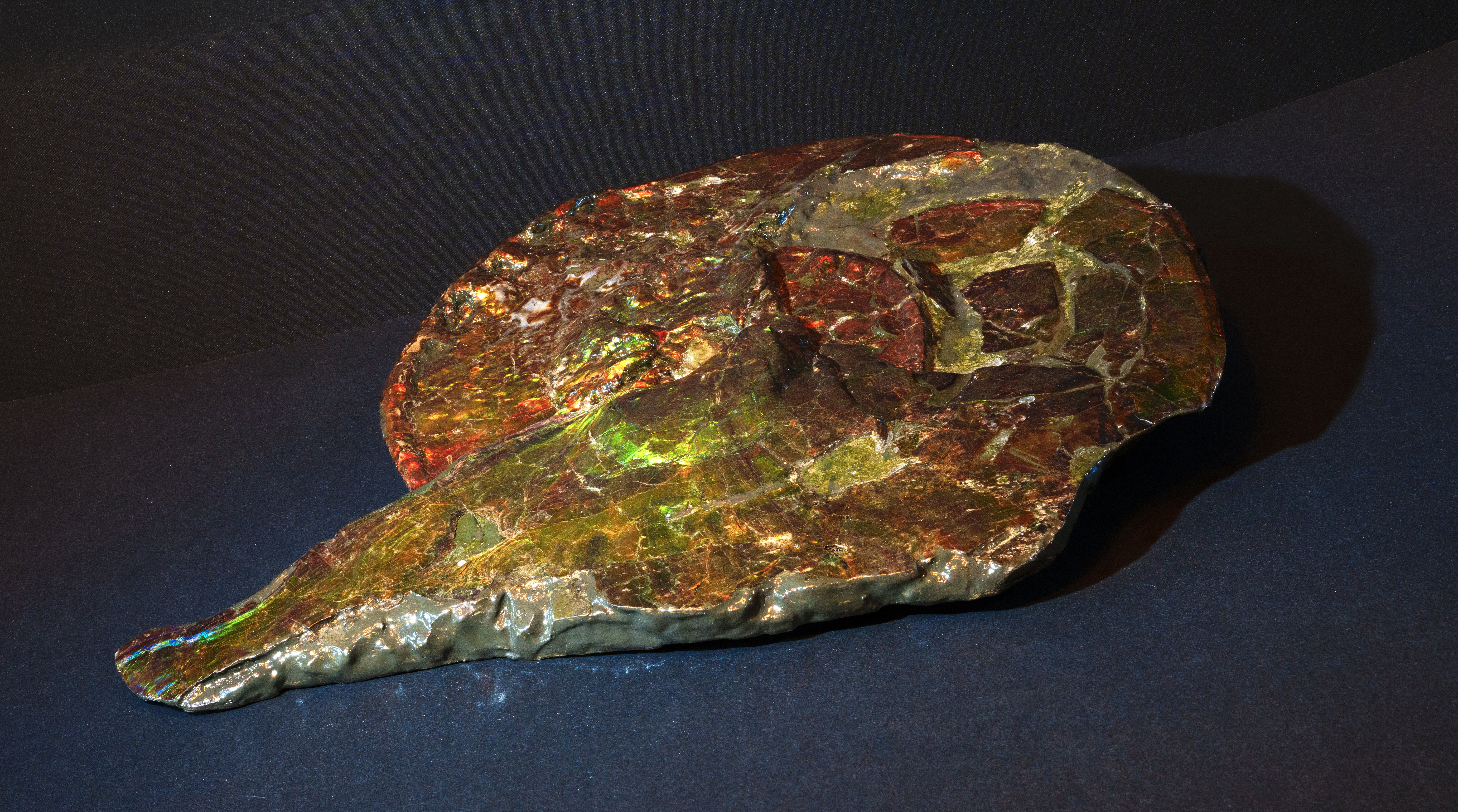 這種色彩並非顏料,而是類似孔雀羽毛或肥皂泡的「結構色」,由殼體微層排列造成光線干涉而形成。許多菊石化石來自加拿大亞伯達省,如今不僅是科學標本,也被加工為珠寶,被稱為 Ammolite。科學與美學,在這些石頭上奇妙地結合。