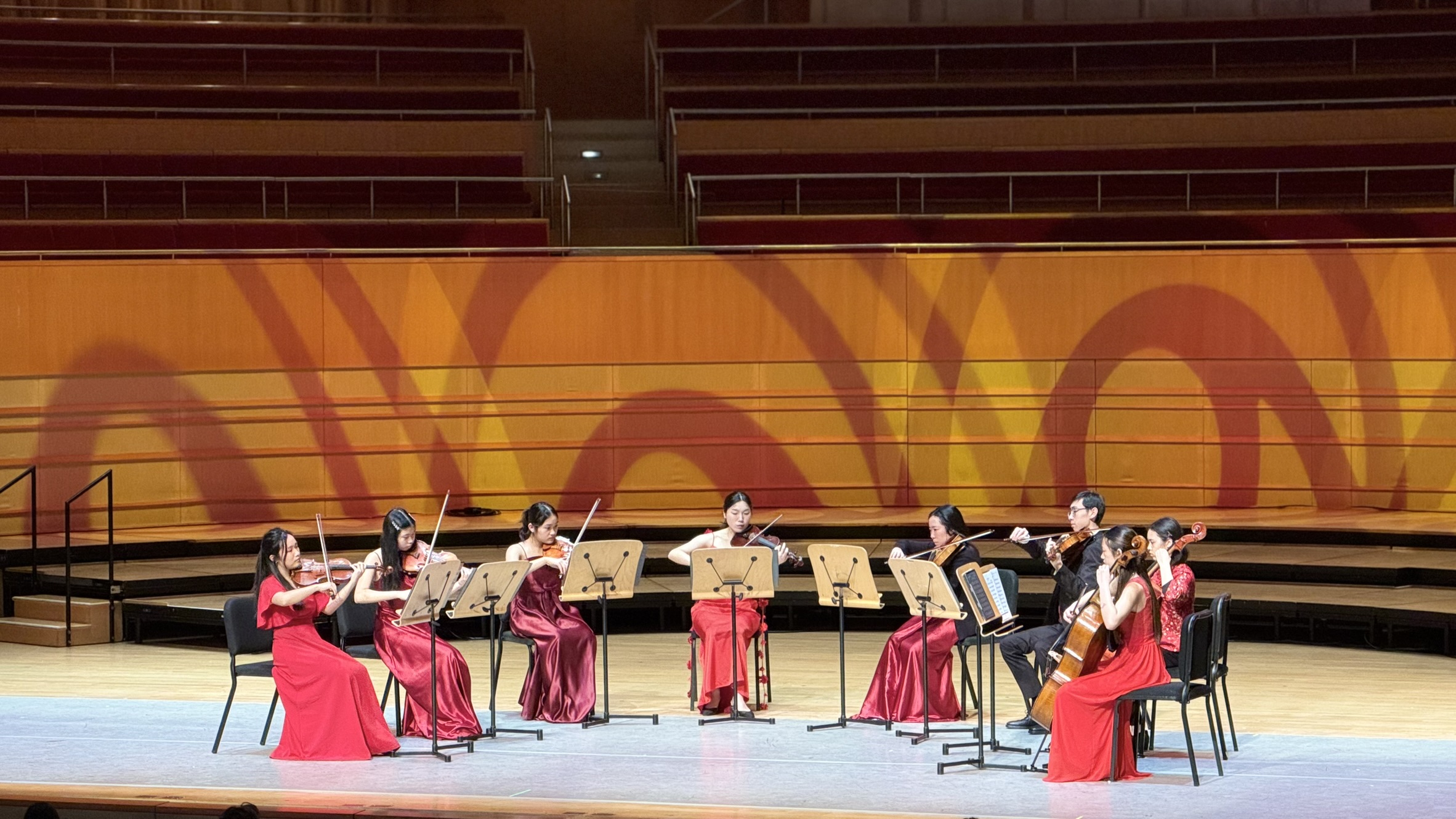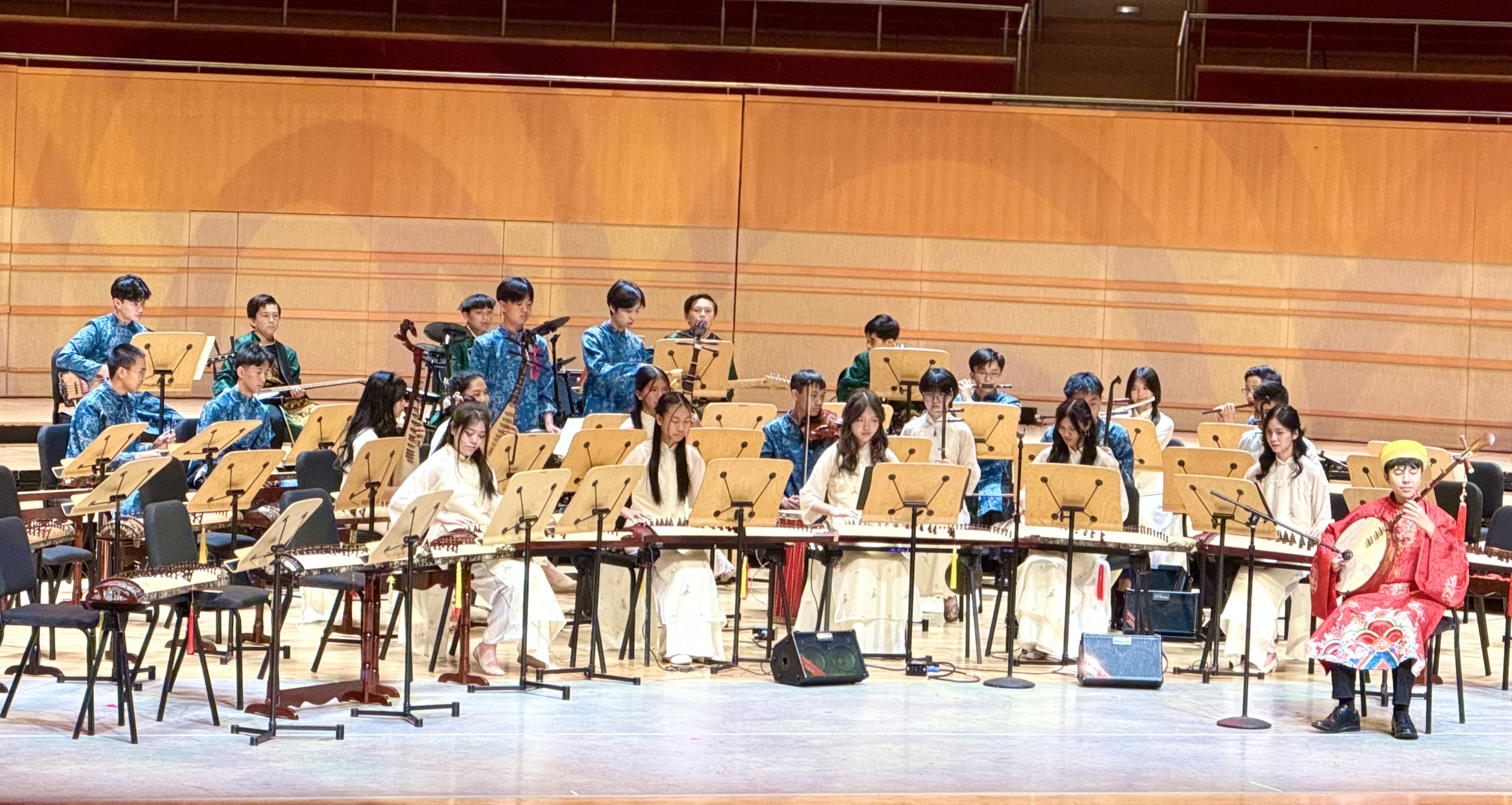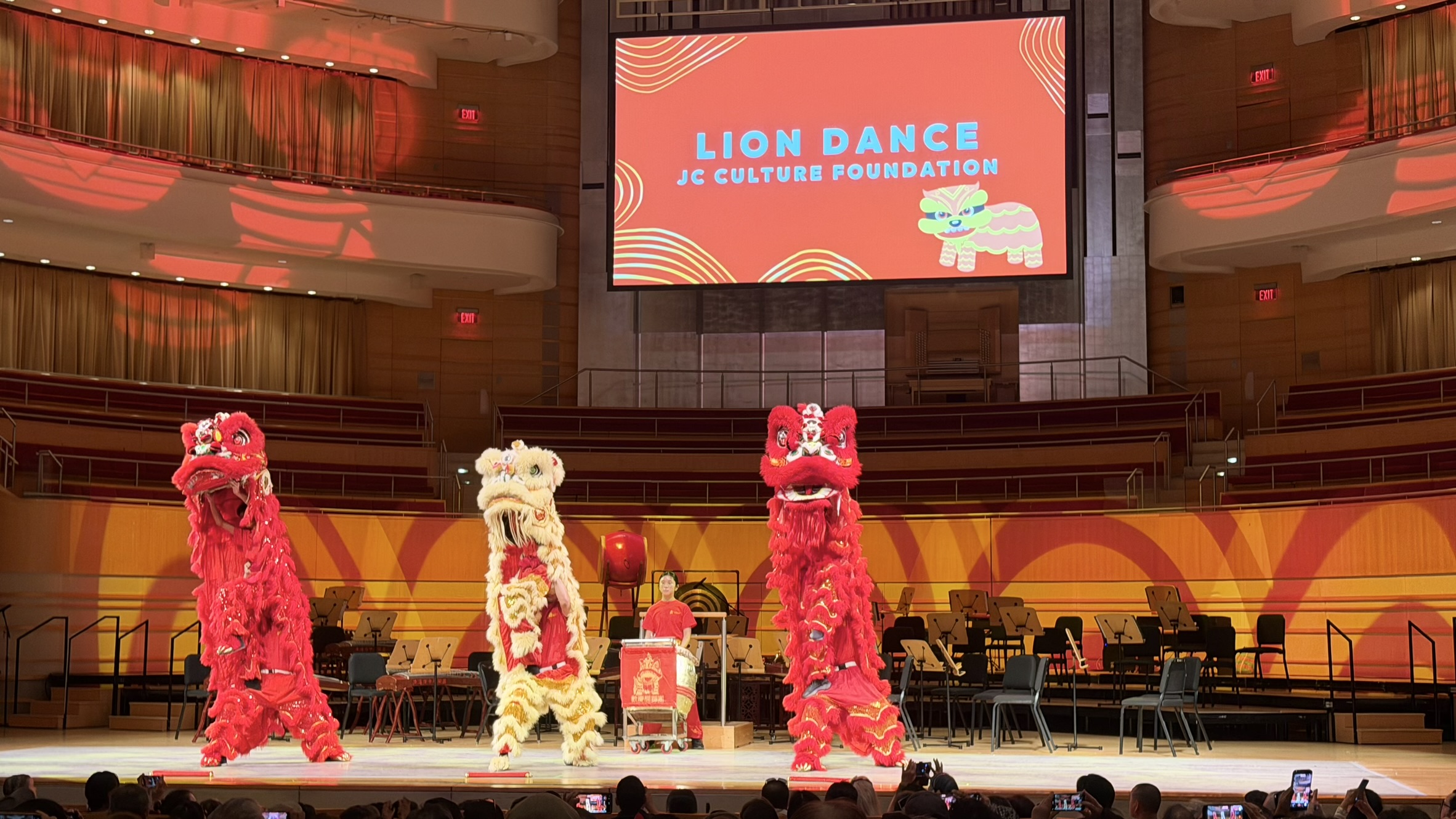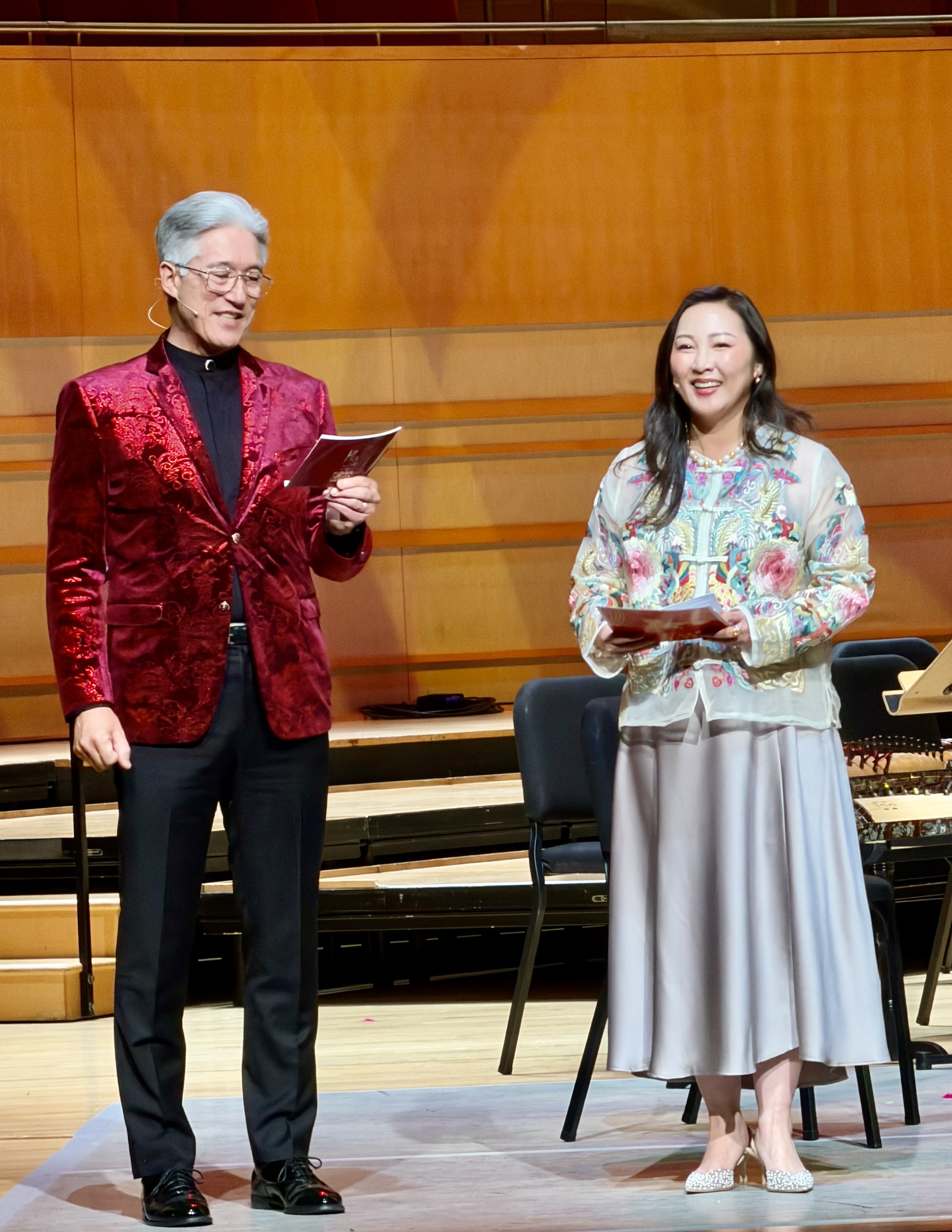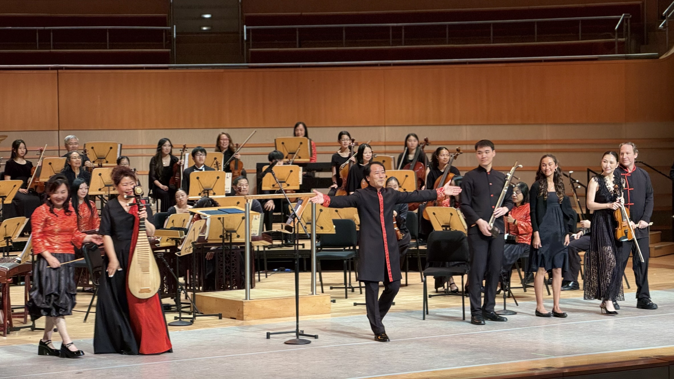 The show opened with three lively lions leaping and unveiling spring couplets. Performers including the South Coast Chinese Orchestra, Pacific Symphony Youth Saxophone Ensemble, and String Octet blended Eastern and Western sounds in a vibrant festive program.
