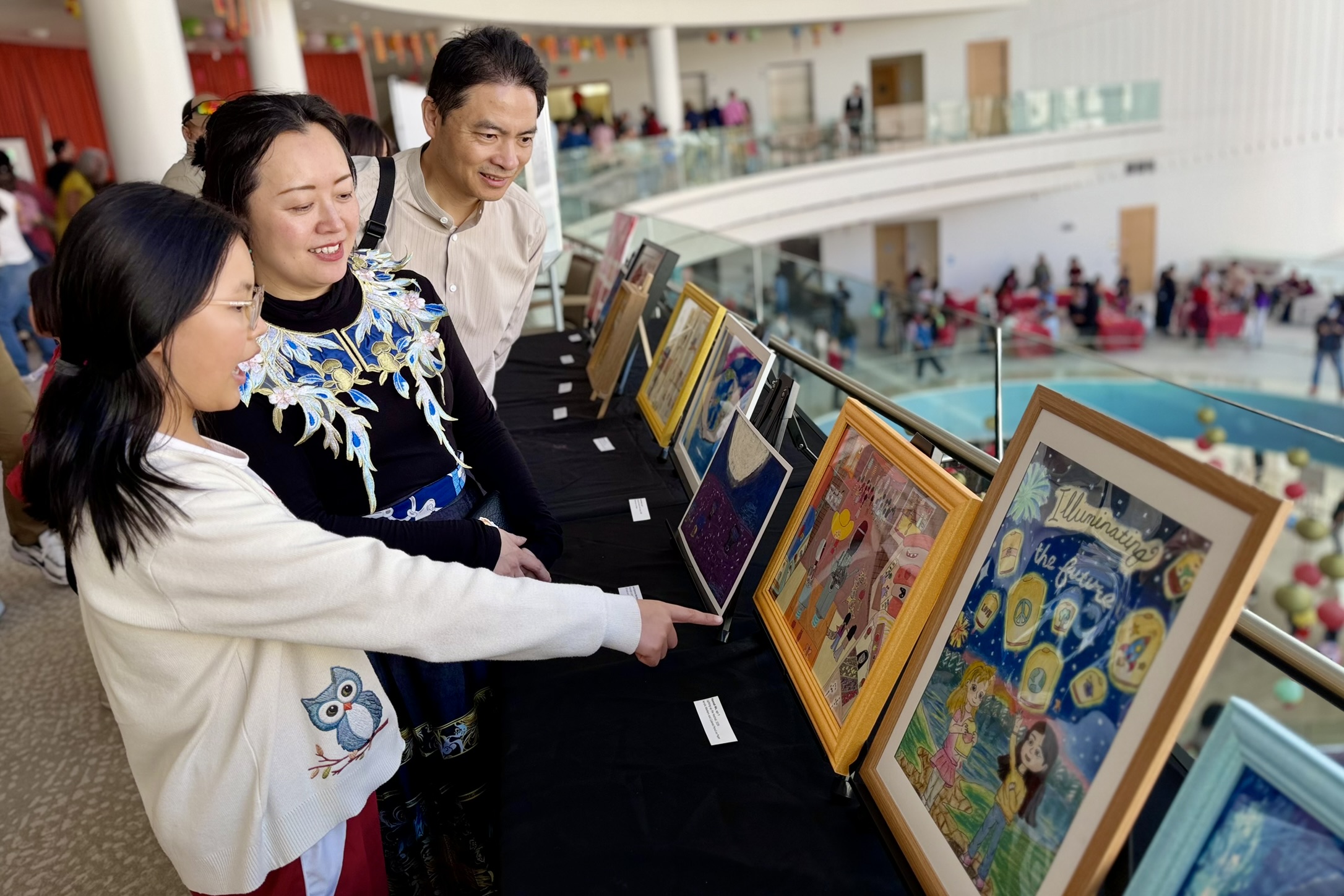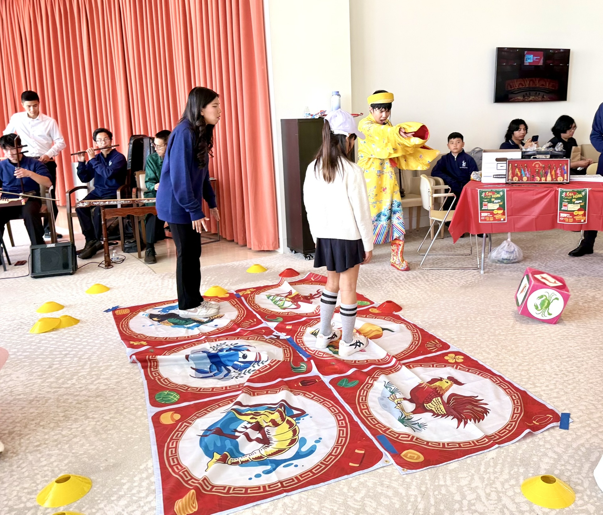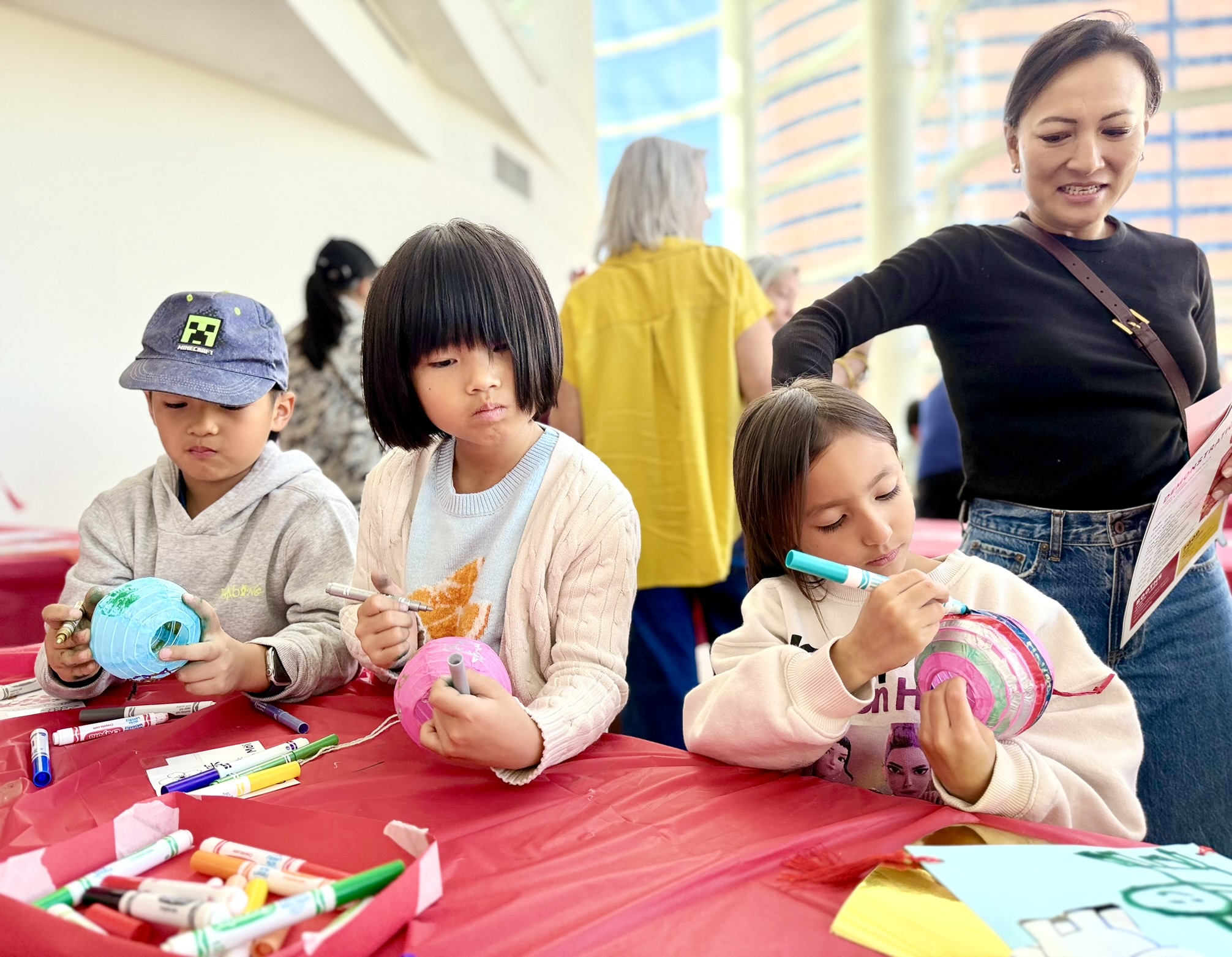The first floor featured live calligraphy and a family photo booth; the second offered paper lantern and fan crafts; the third included a live Vietnamese folk game, traditional rubbing art, and the “Light the Future” exhibit; and the fourth featured Korean drumming and cherry blossom art.