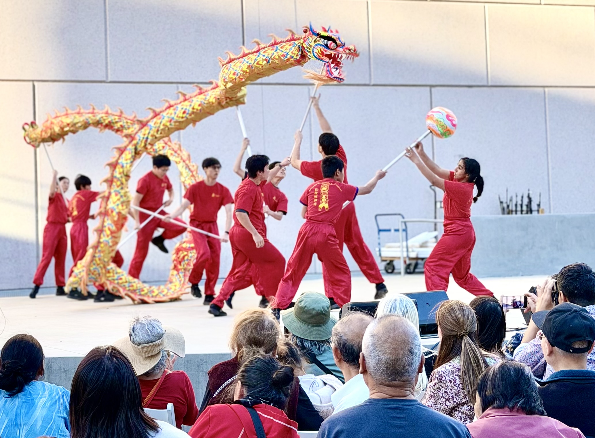 A pipa solo and drum performance by the South Coast Chinese Orchestra drew strong applause. The event ended on a high note as a dragon danced through the stage and crowd.