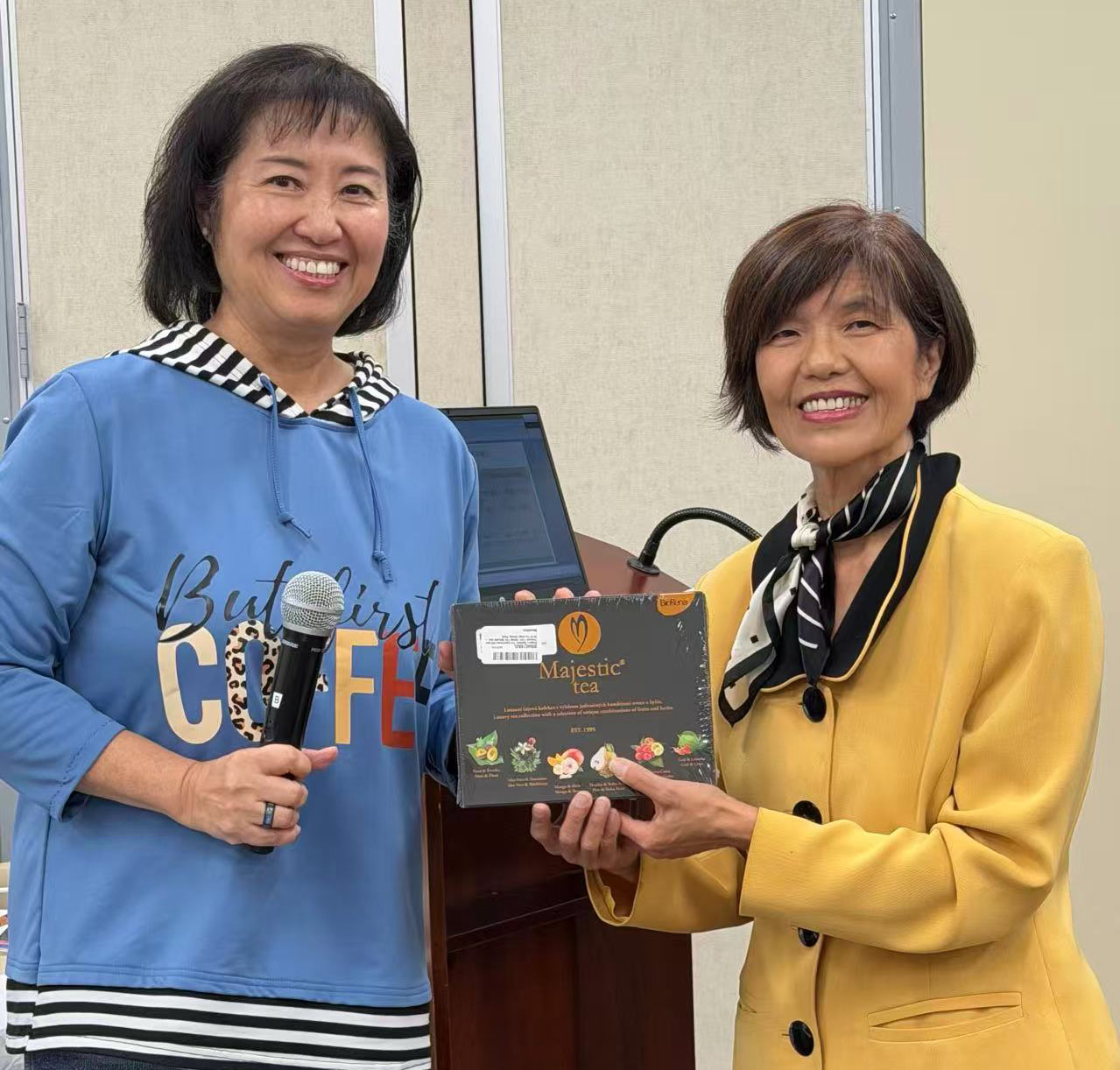 爾灣讀書會副會長潘怡文(左)代表會員致贈小禮物給梁照亮,感謝她精彩的導讀。