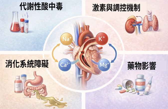 ⬆多重系統引起電解質(Na+, K+, Ca2+, Mg+)不平衡